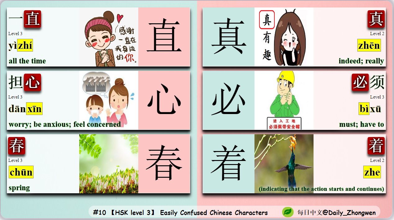 每日中文on Twitter Hsk Vocabulary Learn Chinese No 10 Hsk 3 Easily Confused Chinese Characters 1 一直all The Time 真indeed Really 2 担心worry Be Anxious Feel Concerned 必须must Have To 3 春spring 着 Indicating That The Action Starts